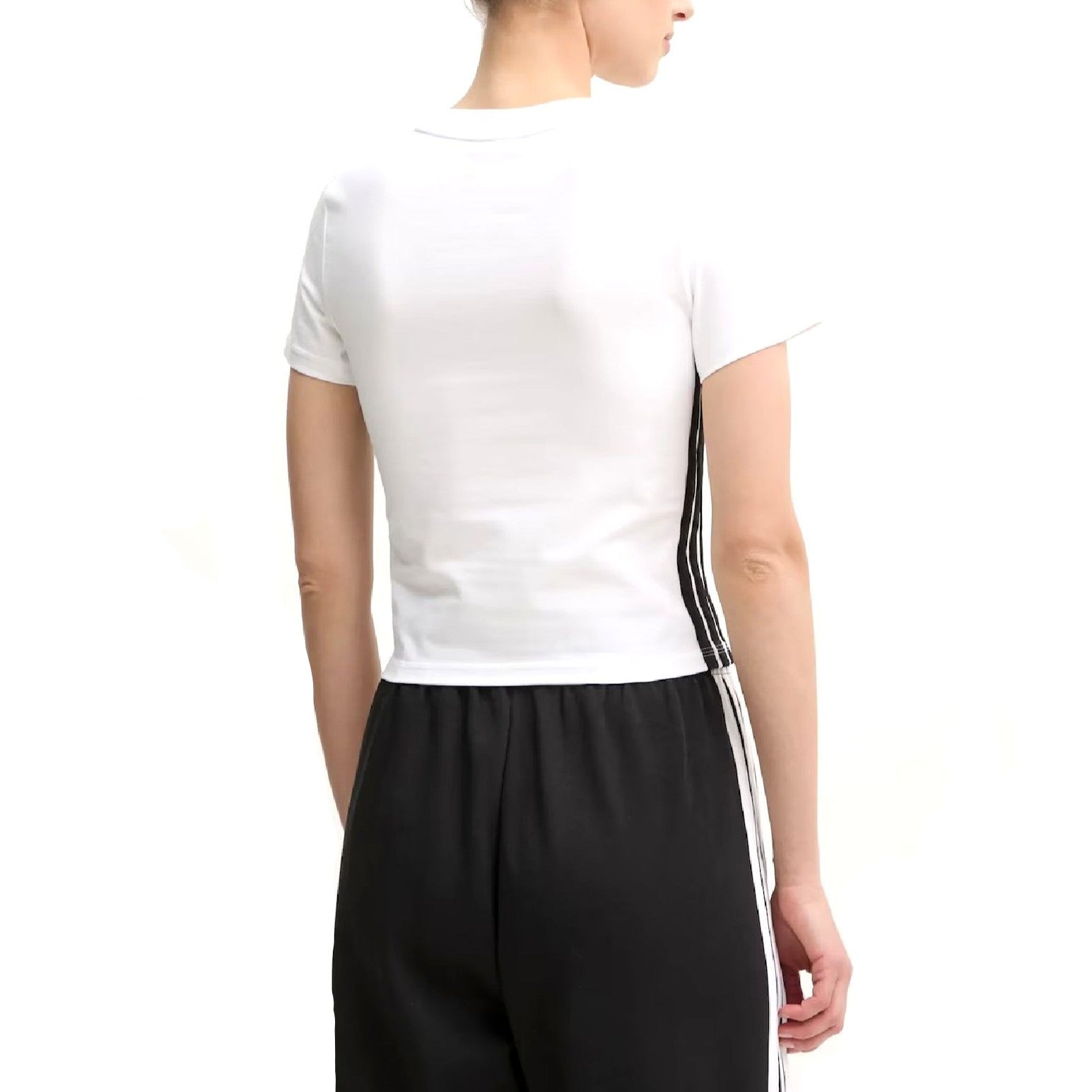 Realizzata in morbido jersey di cotone (Single Jersey) con una leggera componente elastica, garantisce comfort assoluto e una vestibilità perfetta. Il look è caratterizzato dalle iconiche tre strisce nere che scorrono lungo i fianchi e dal logo Adidas centrale sul petto, creando un contrasto netto e dinamico. Ideale da abbinare a pantaloni sportivi o jeans a vita alta per un outfit streetwear di tendenza.