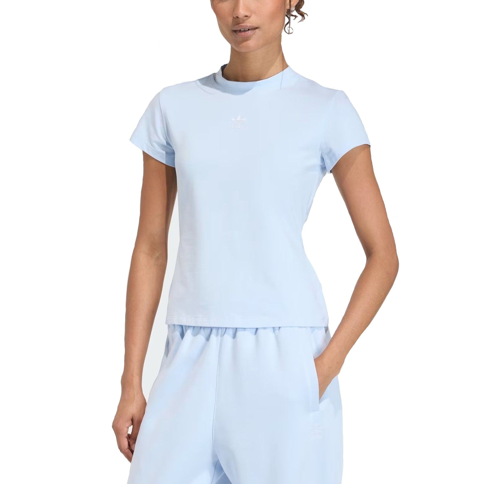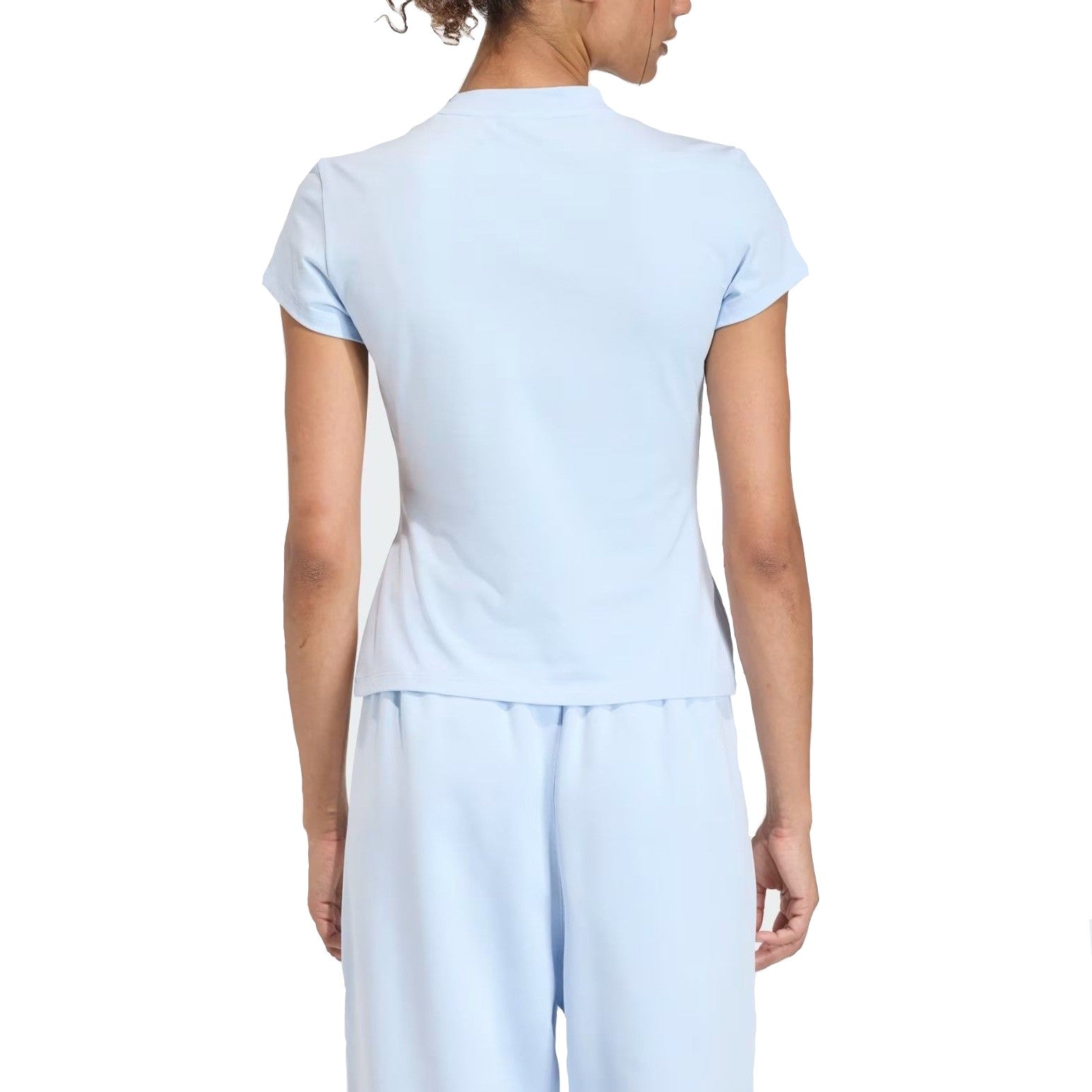 Il delicato color celeste conferisce una nota di freschezza al tuo outfit, mentre il piccolo logo Trefoil bianco ricamato al centro del petto aggiunge un tocco di autenticità sportiva. Dotata di un classico girocollo a coste e maniche corte, questa t-shirt è estremamente versatile: ideale da abbinare a pantaloni sportivi coordinati per un total look relax o a un paio di jeans a vita alta per un'uscita casual. Un capo iconico e immancabile nel guardaroba femminile contemporaneo.