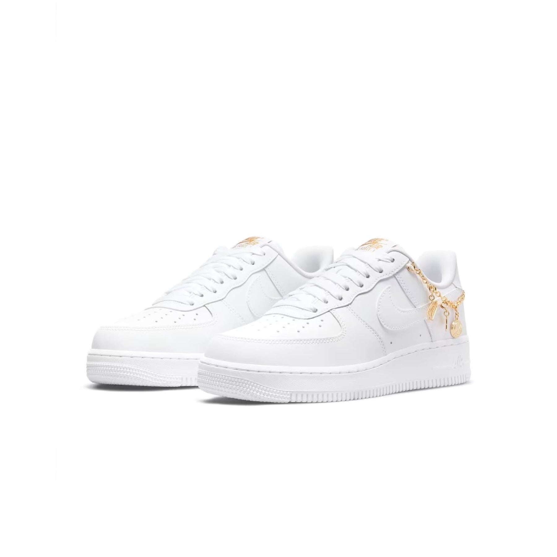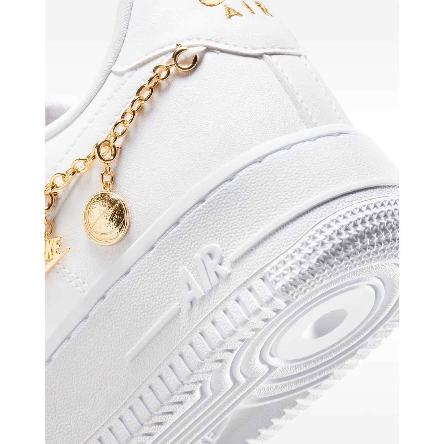 Il vero tocco di classe è rappresentato dalla catenella dorata rimovibile agganciata lateralmente, impreziosita da tre ciondoli iconici: una scatola da scarpe, il logo Nike e un pallone da basket. L'intersuola in schiuma con ammortizzazione Nike Air integrata offre una calzata confortevole per tutto il giorno, mentre la suola in gomma assicura trazione e resistenza. Un design sofisticato che unisce perfettamente l'estetica sportiva a dettagli gioiello raffinati.