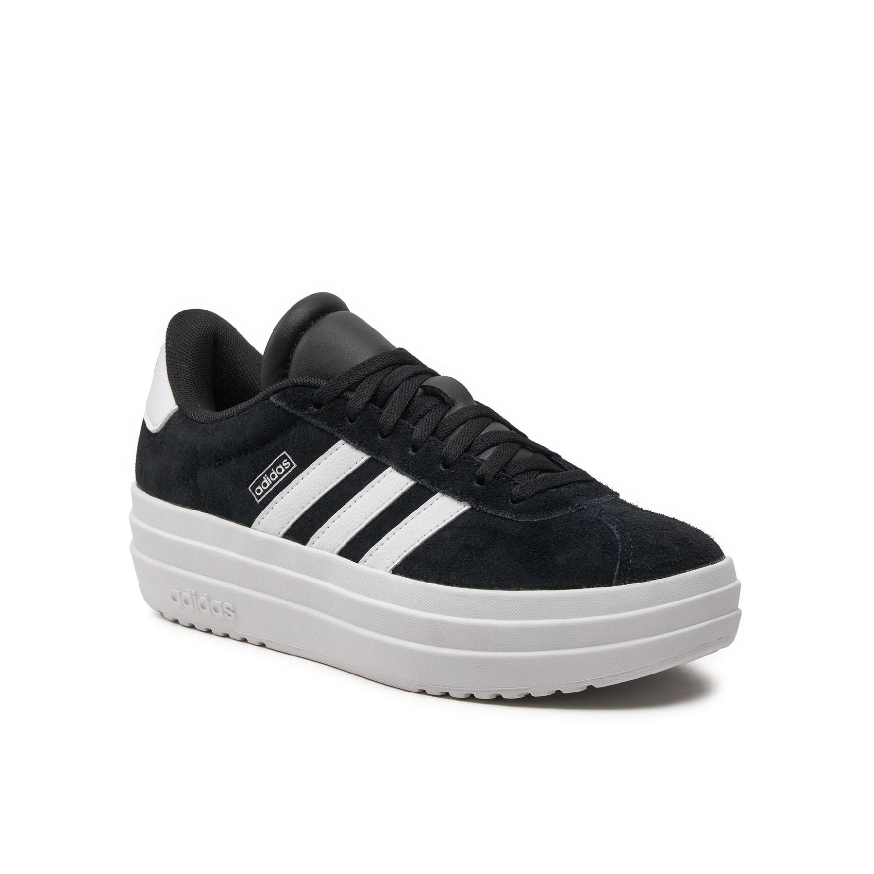 Le sneaker Adidas VL Court Bold J reinterpretano un classico del design skate in chiave contemporanea. Questo modello si distingue per la sua audace suola platform in gomma, che aggiunge altezza e uno stile deciso a ogni passo. La tomaia è realizzata in pregiato suede nero, offrendo una sensazione di morbidezza e resistenza, mentre le iconiche tre strisce bianche a contrasto e il rinforzo sul tallone richiamano l'eredità sportiva del brand.